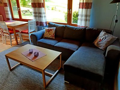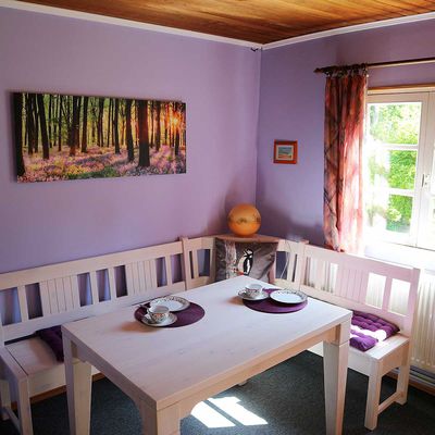 - Wohnzimmer mit Essecke und Fernseher