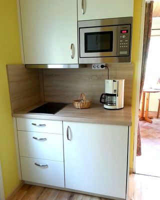 - Küche mit Kühlschrank, Doppelkochplatte, Mikrowelle Kaffeemaschine, Toaster und Wasserkocher